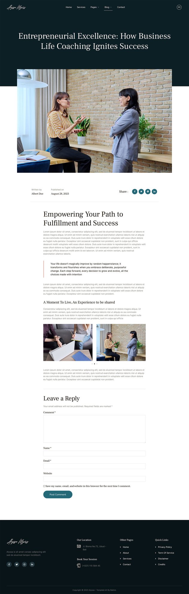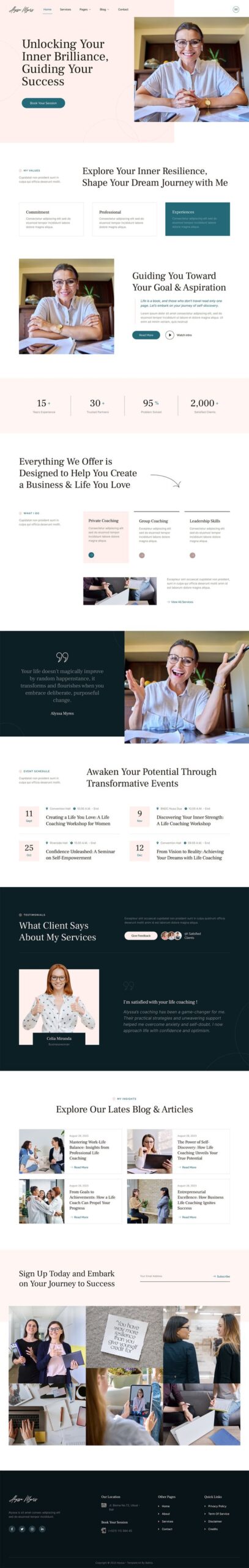 Alyssa is an Elementor Template Kit for anyone looking to create a captivating online presence in the world of Feminine Life Coaching. Perfectly tailored for Life Coaches, Motivational Speakers, Workshop Facilitators, Business Coaches, Personal Coaches, Career Consultants, and Life Planners, Alyssa offers a fresh and feminine touch to your website.