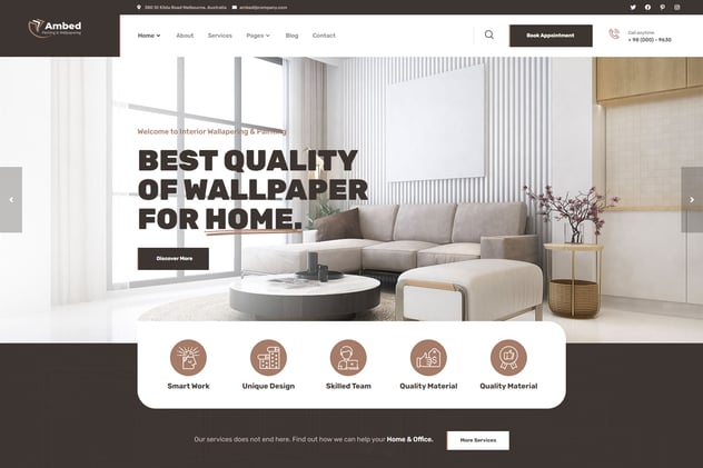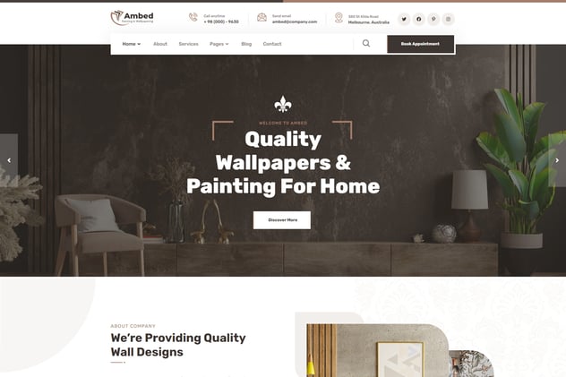 Ambed – Wallpapers & Painting Services Template Kit is a modern and clean Elementor Template Kit ideal for any wallpapering services, painting services, interior design, exterior design, architecture, room painting, coloring and all wallpapers and painting related businesses and websites.