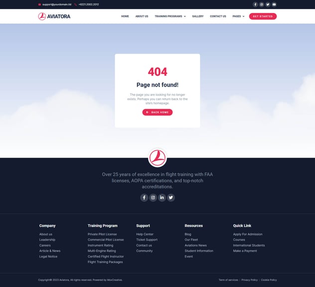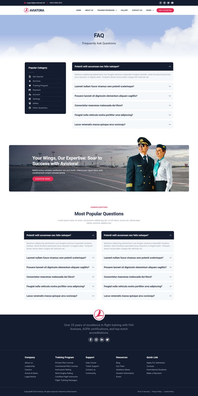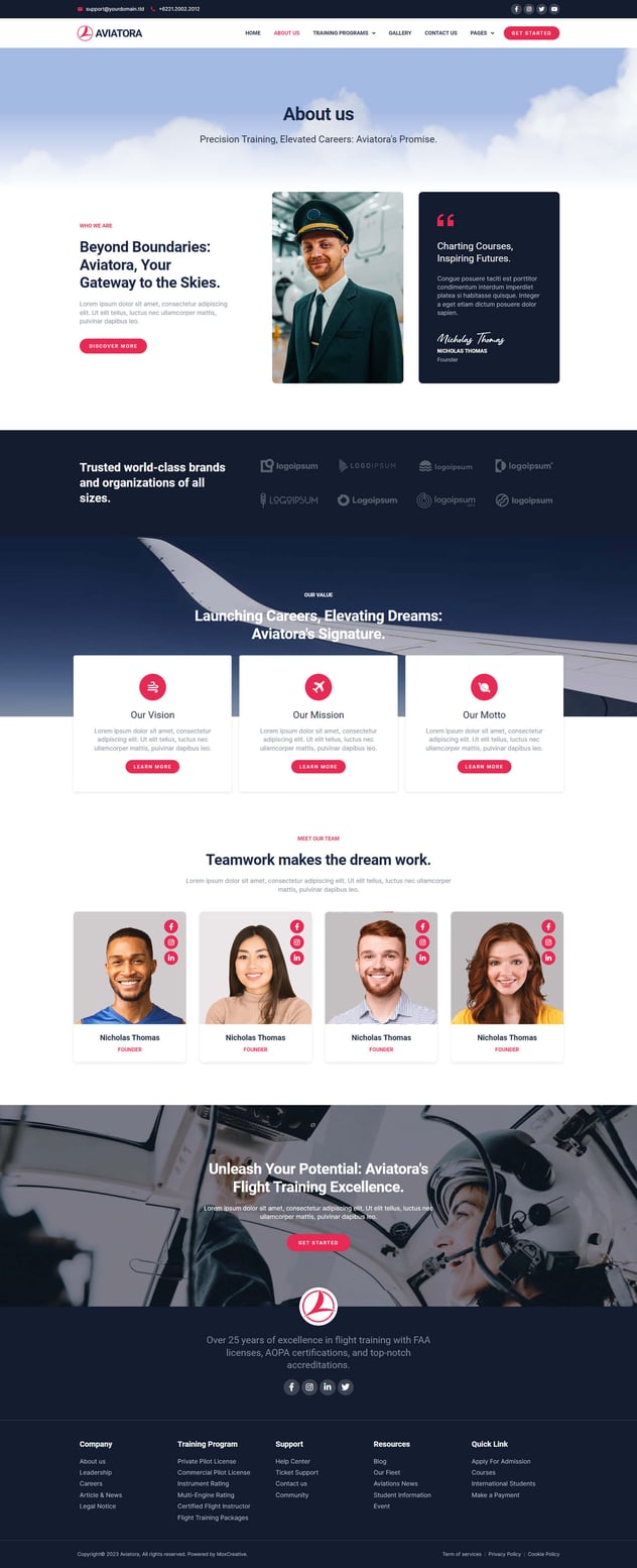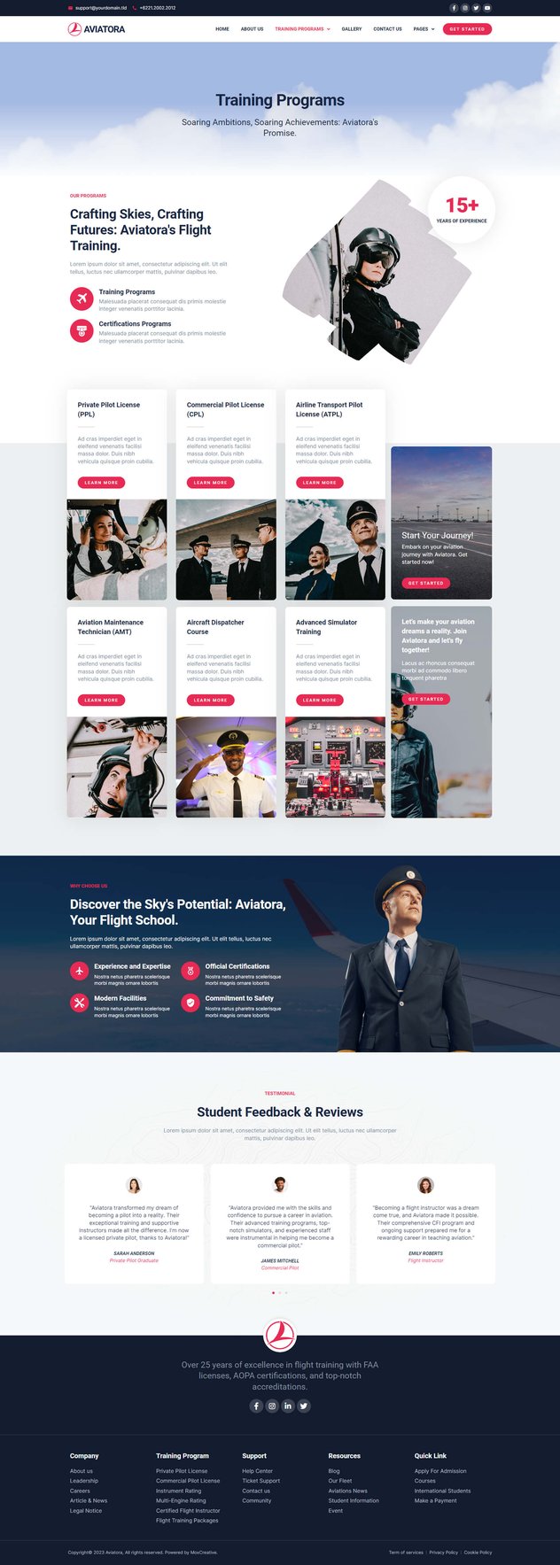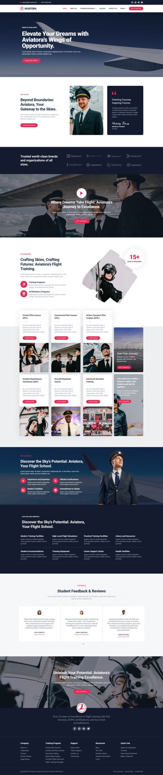 Aviatora is Elementor Pro Template Kit for Aviation & Flight School website. This template has clean, modern, and professional look. You can easily build modern aviation website, flight school, pilot academy, cabin crew, and flight attendant training, aviation industry, or any other related business.