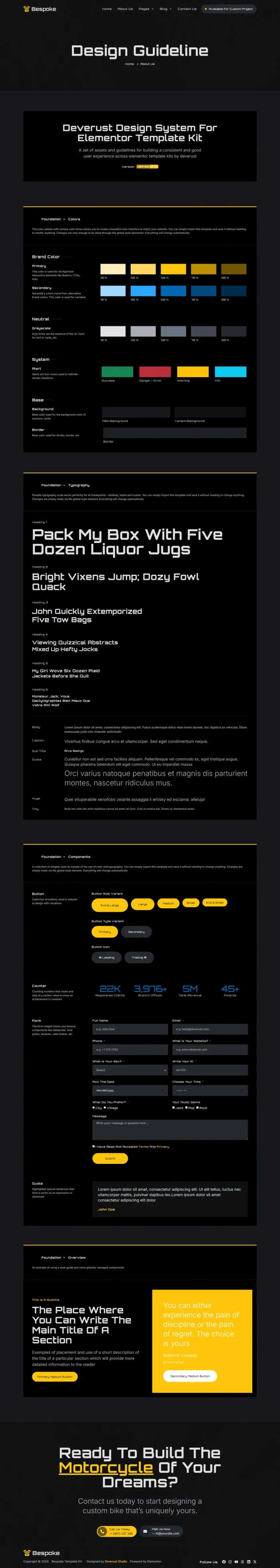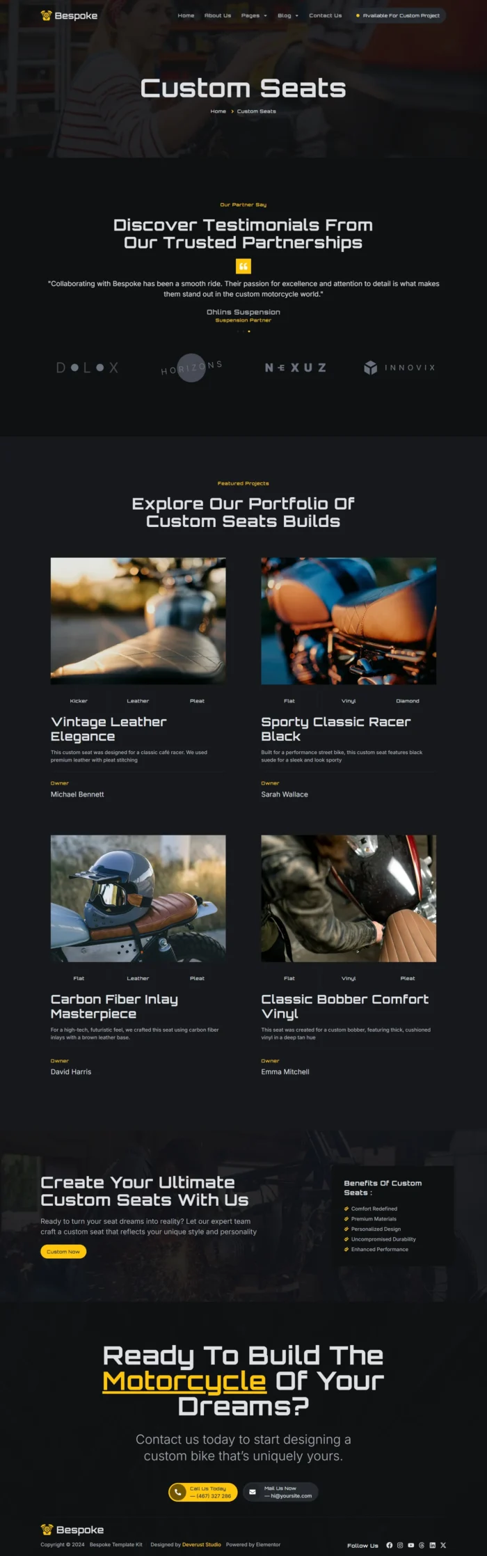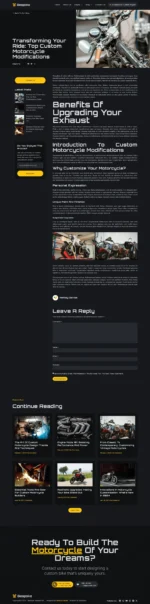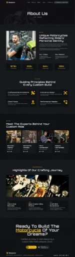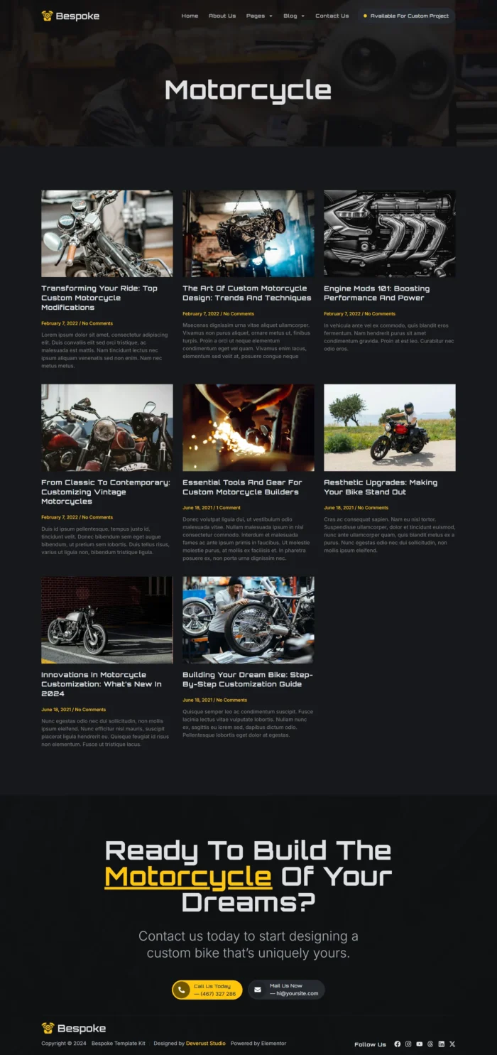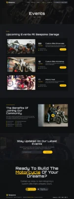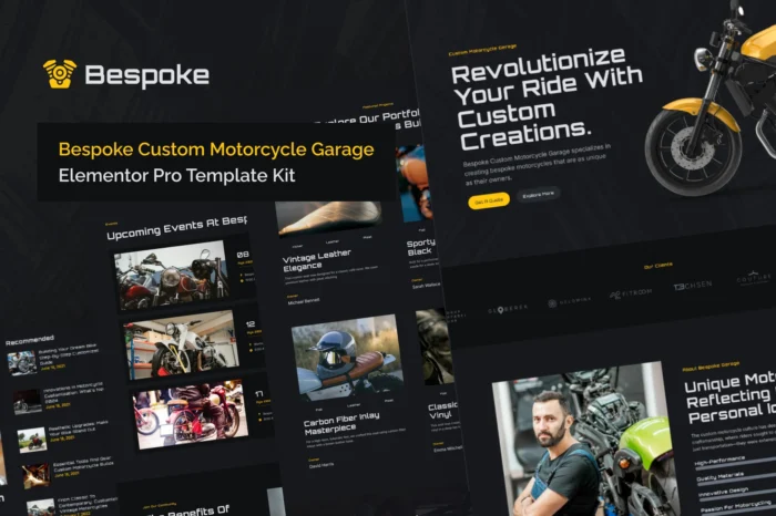 *Bespoke is a Custom Motorcycle Garage Elementor Pro template kit, crafted for those in the motorcycle customization industry. Designed to harness the full power of WordPress and Elementor, this template kit offers a seamless drag-and-drop experience that allows you to build a stunning, fully-functional website without touching a single line of code. Whether you’re a custom bike builder, garage owner, or mechanic looking to showcase your services, builds, and expertise, Bespoke is tailored to meet the needs of this niche market, reflecting the bold and unique spirit of motorcycle craftsmanship.