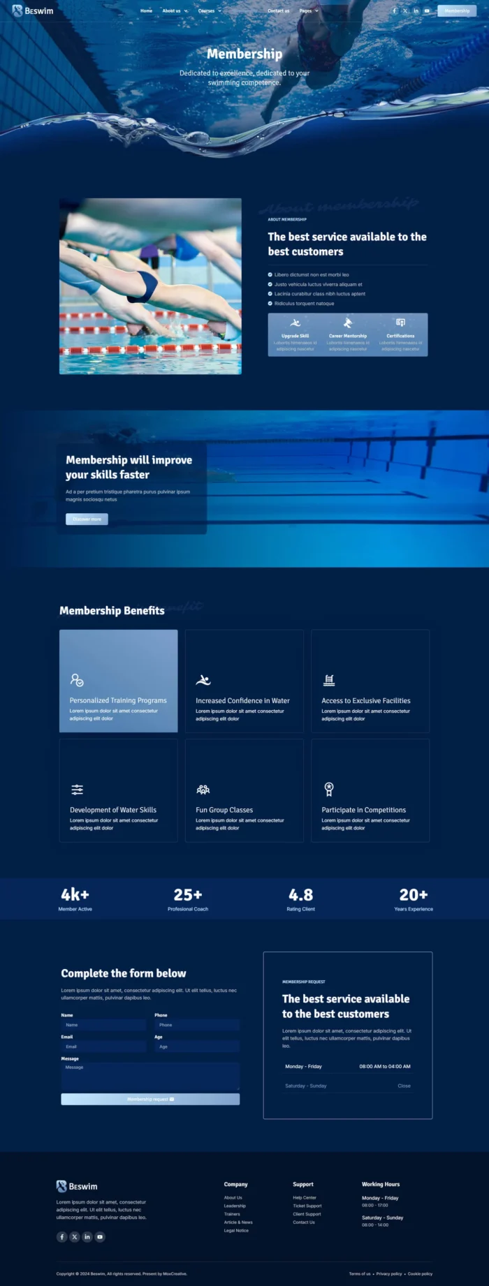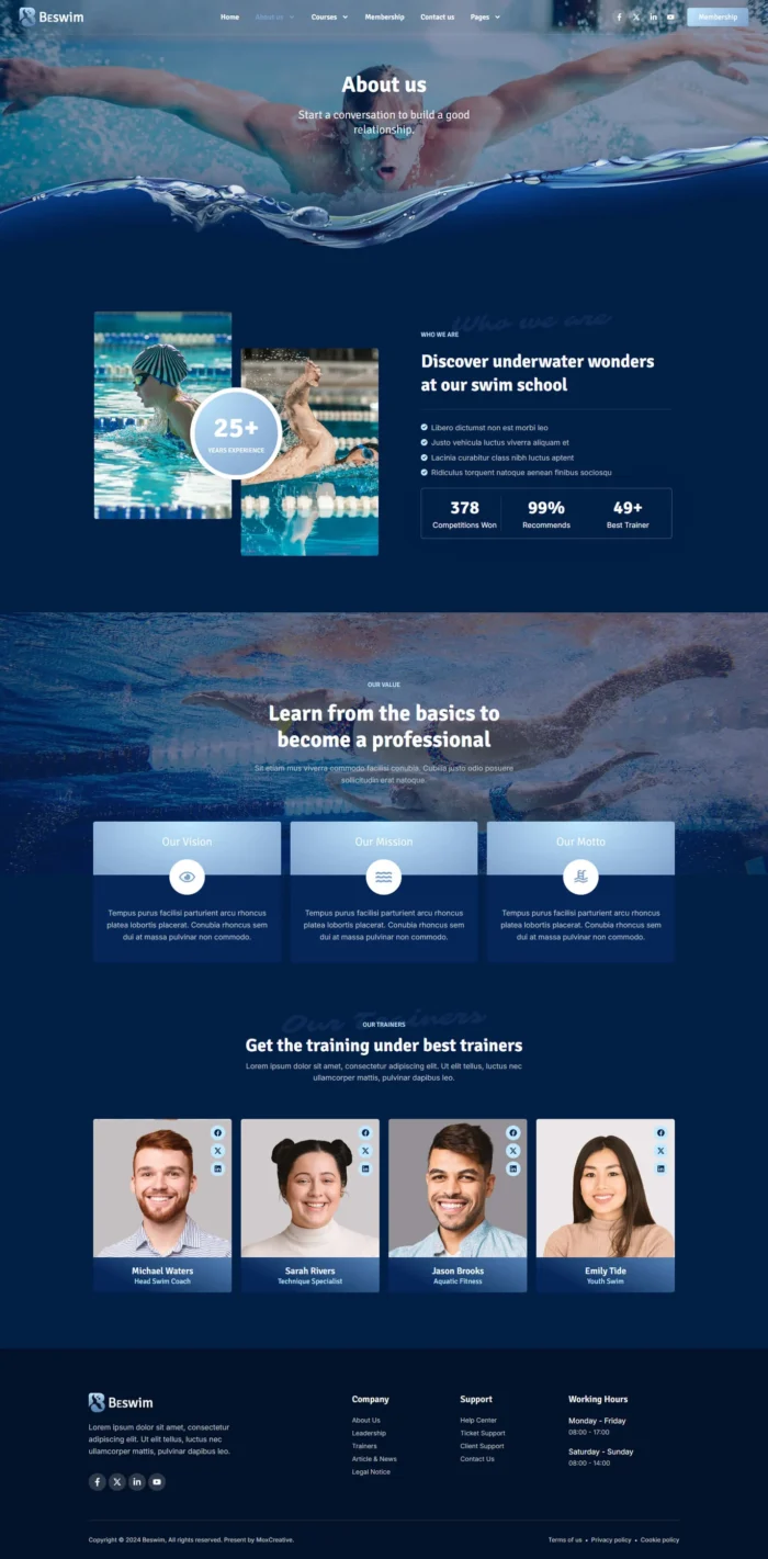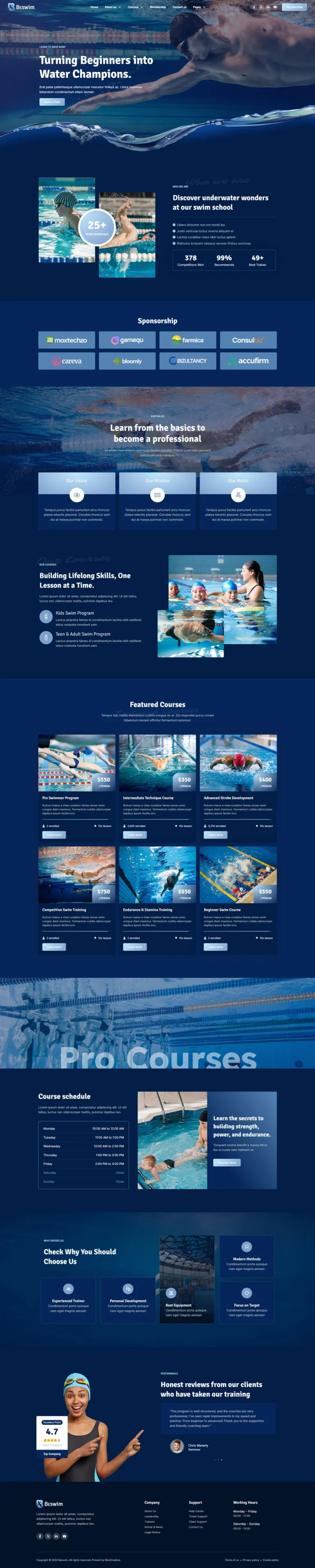 BeSwim is an Elementor Pro Template Kit for Swimming Courses & Training website. It has 12+ pre-built templates with clean design and modern style. It has 12+ pre-built templates with cool design and modern style. You can also use this creative template kit for any kind of website related to courses, club, and training, etc. Save your time to make professional Swimming Courses & Training website with this elementor kit. Just drag and drop, no coding required.