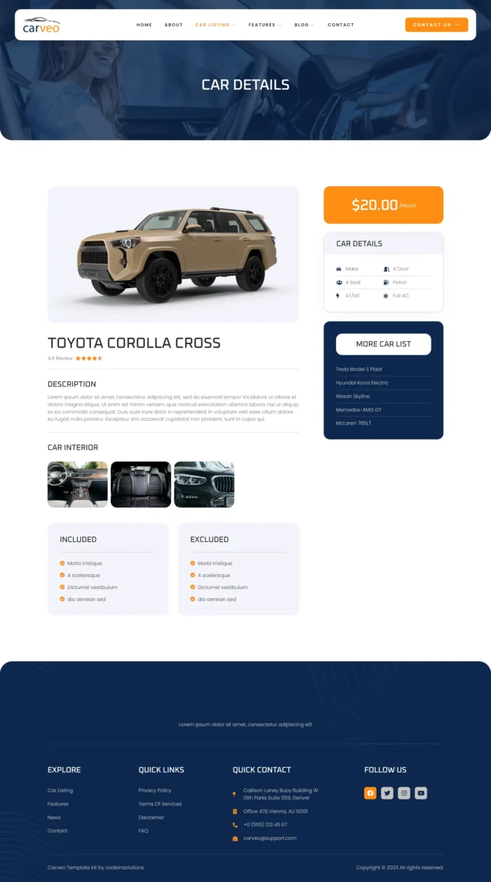 This comprehensive template kit includes a versatile collection of 16+ meticulously designed templates, covering essential pages such as the homepage, car listings, booking, and more. Each template is thoughtfully crafted to showcase your fleet, simplify the reservation process, and enhance the overall rental experience.