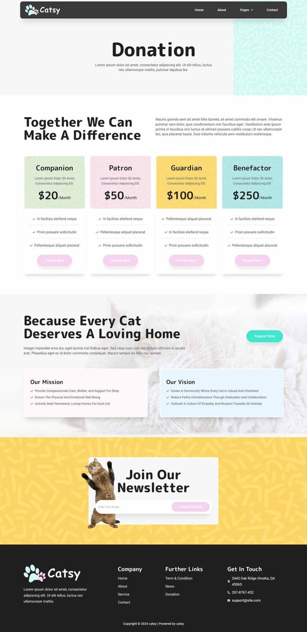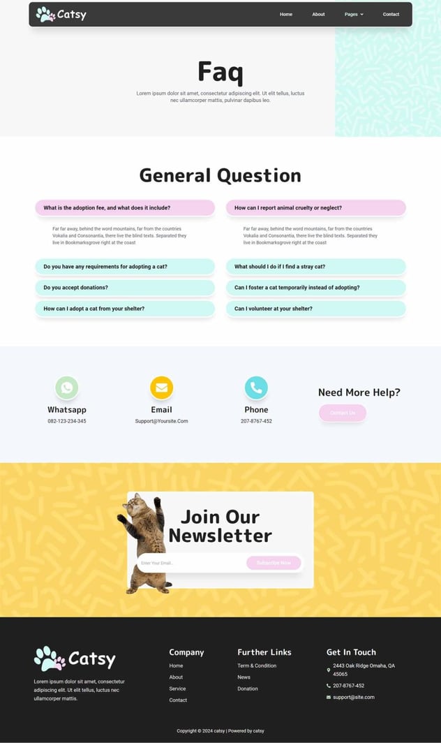 Catsy is an Elementor Template Kit for quickly and easily creating websites for your pet shelter or cat business using the Elementor Page Builder plugin for WordPress. This is not a WordPress theme. Template Kits contain page content for Elementor page builder. This kit has been optimized for use with the free Hello Elementor theme but may be used with most themes that support Elementor.