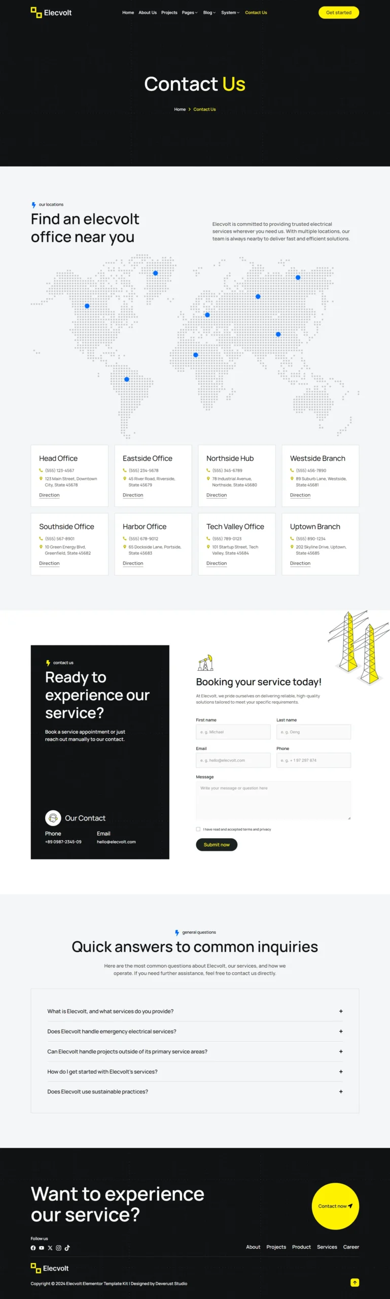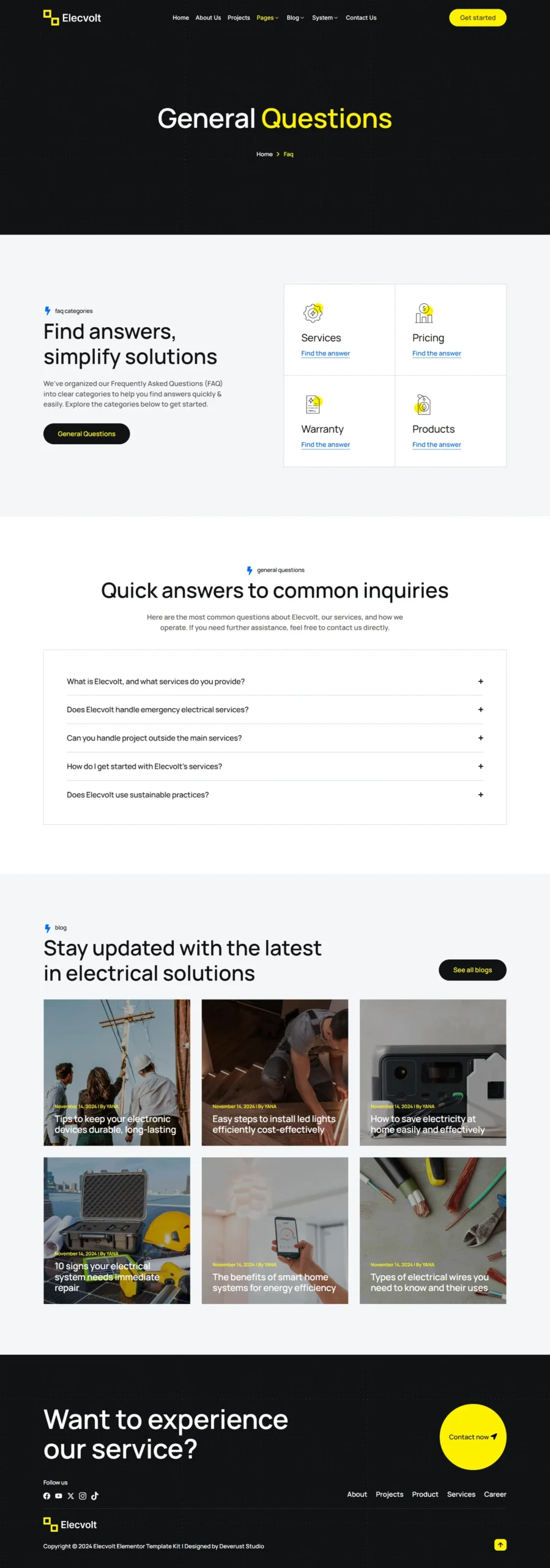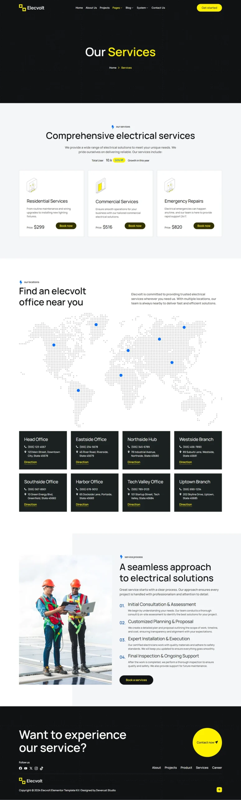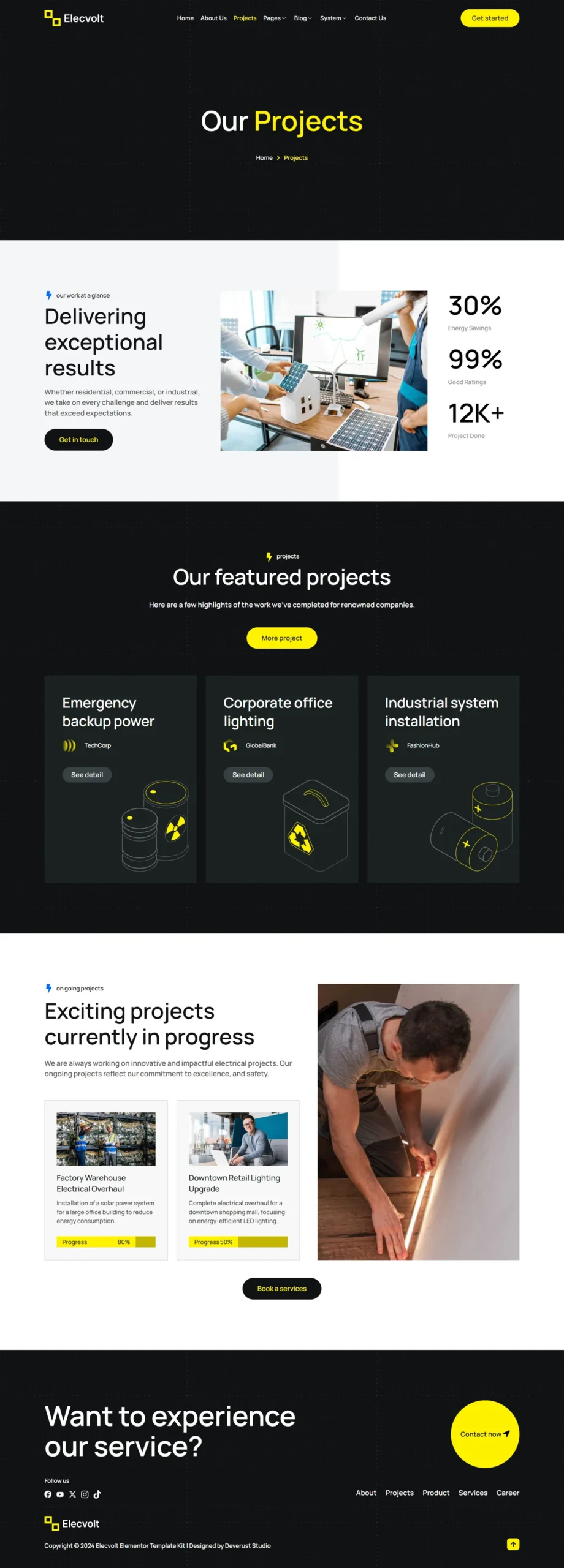 Elecvolt is an Elementor Template Kit for creating a dynamic website tailored to the Electrician & Electrical Services industry. Leveraging the power of Elementor and WordPress, this template offers a seamless user experience with its drag-and-drop page builder and vast library of widgets. Elementor provides the flexibility to design and customize each page effortlessly, while WordPress ensures a robust backend system for content management.