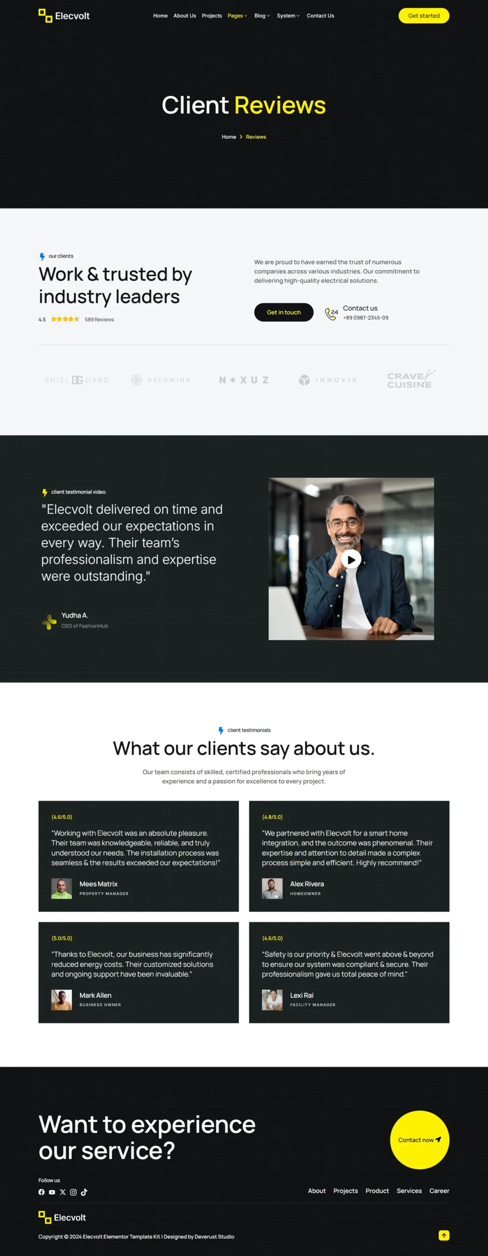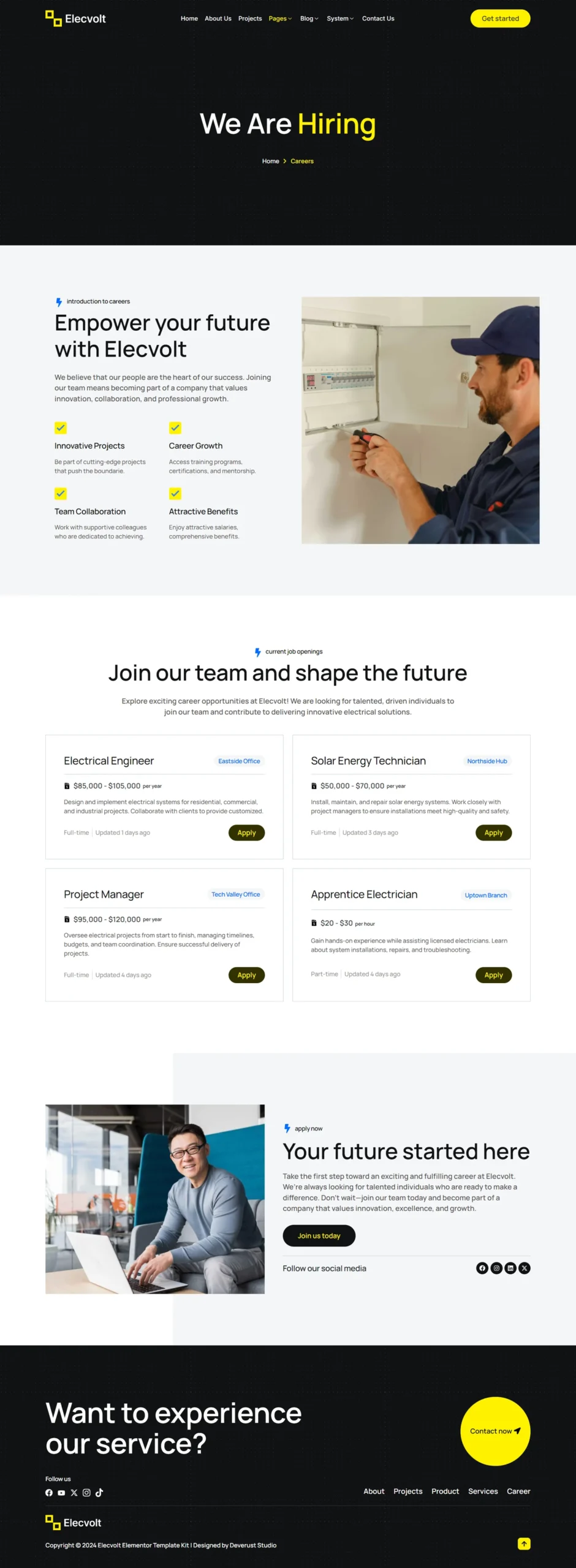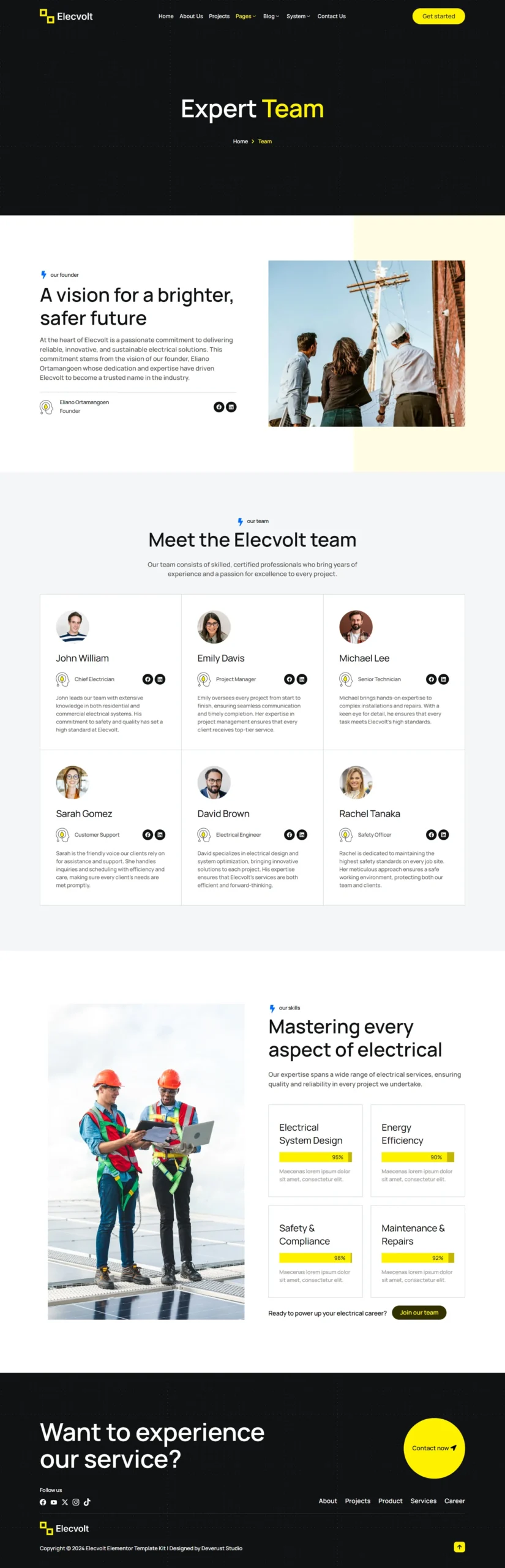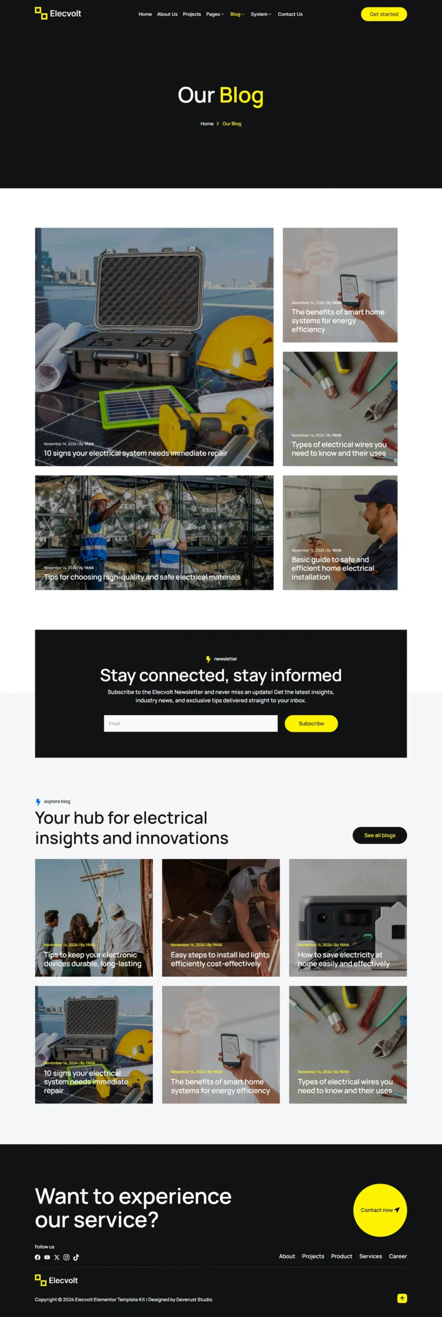 Elecvolt is an Elementor Template Kit for creating a dynamic website tailored to the Electrician & Electrical Services industry. Leveraging the power of Elementor and WordPress, this template offers a seamless user experience with its drag-and-drop page builder and vast library of widgets. Elementor provides the flexibility to design and customize each page effortlessly, while WordPress ensures a robust backend system for content management.