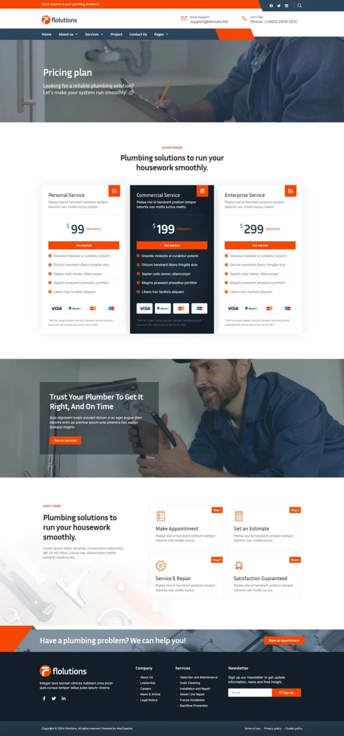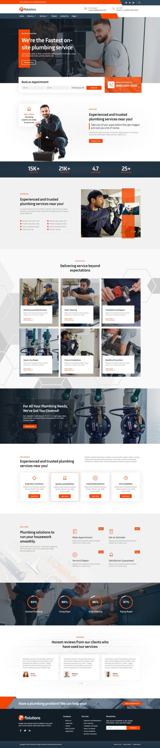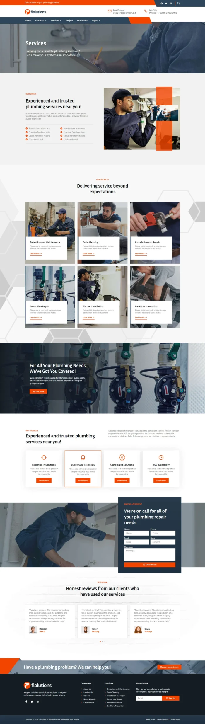 Flolution is an Elementor Template Kit for plumbing service websites. This template has modern layout with simple, professional and clean style. Suitable for any business related to plumbing service & repair. You can easily build any website related to any service and maintenance such as plumbing website, painting service, handyman, cleaning service, home repair etc. Just drag and drop, no coding required.