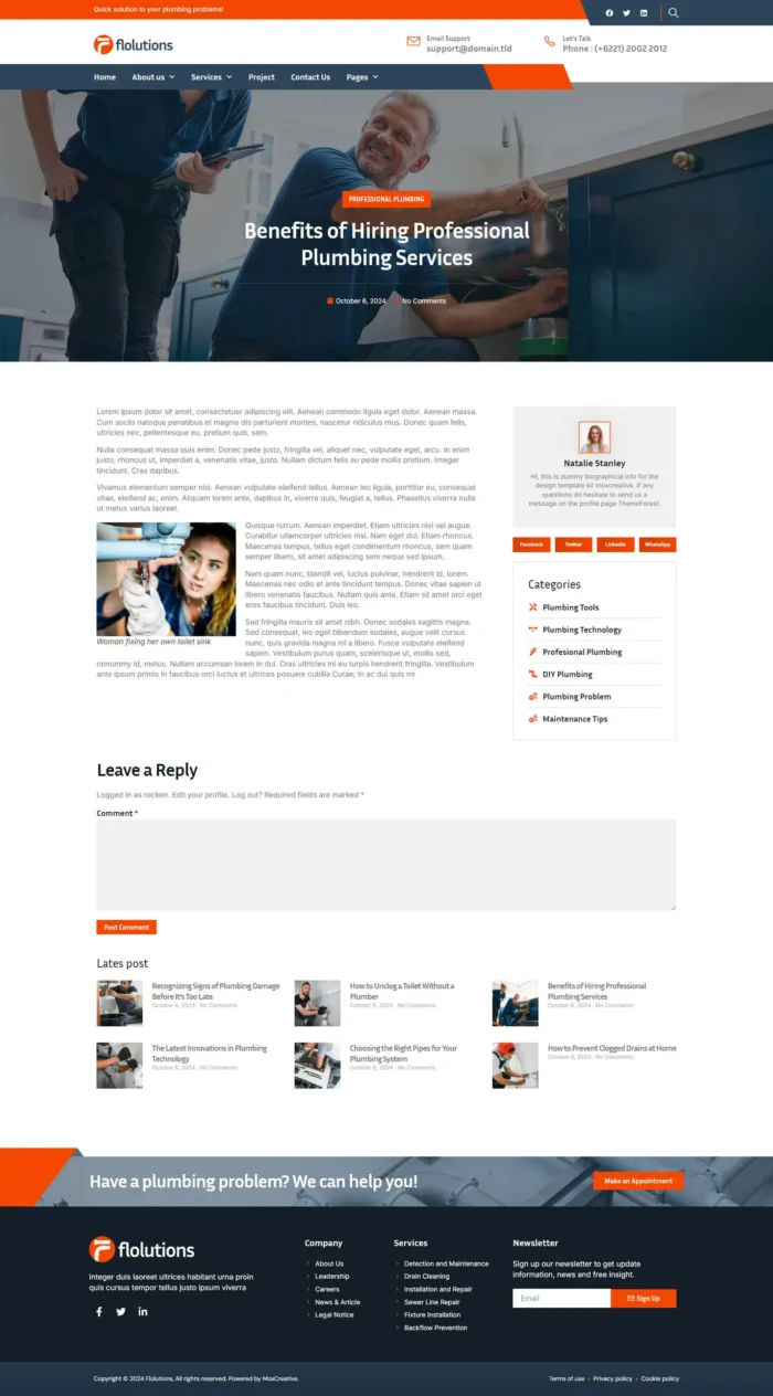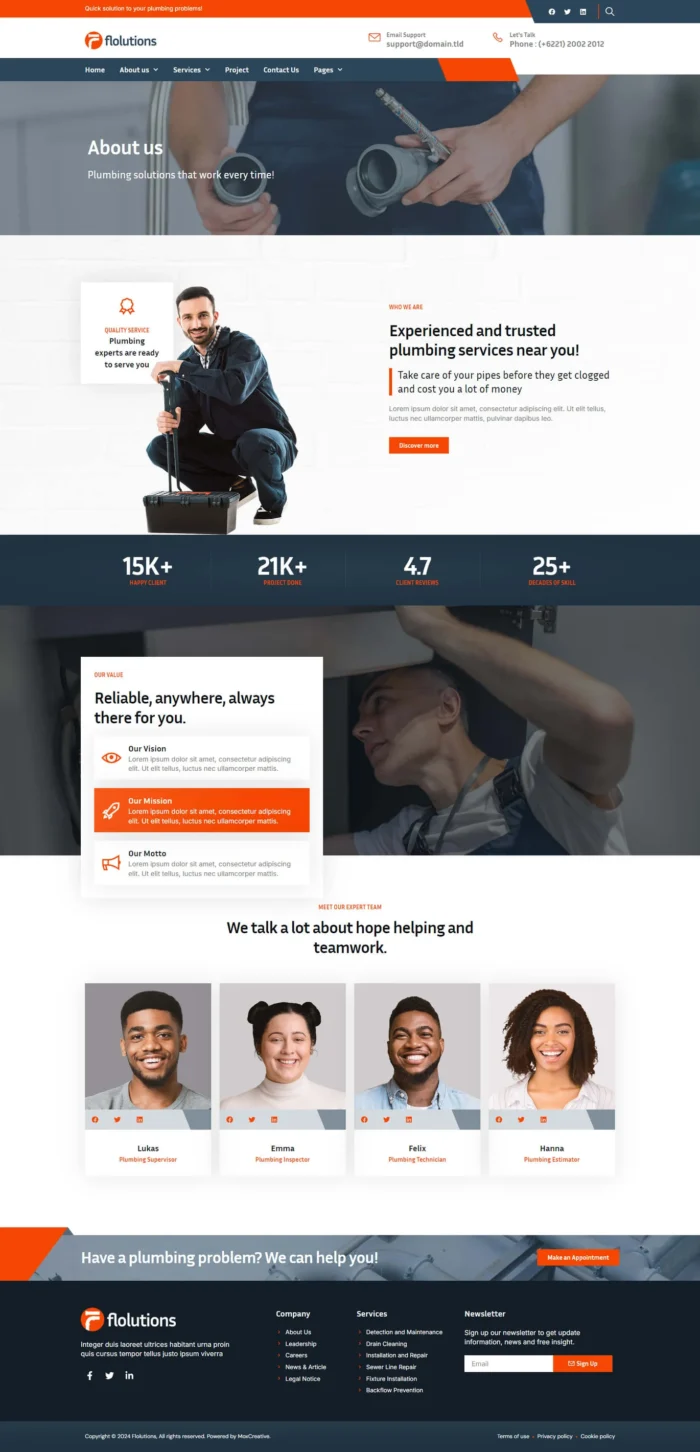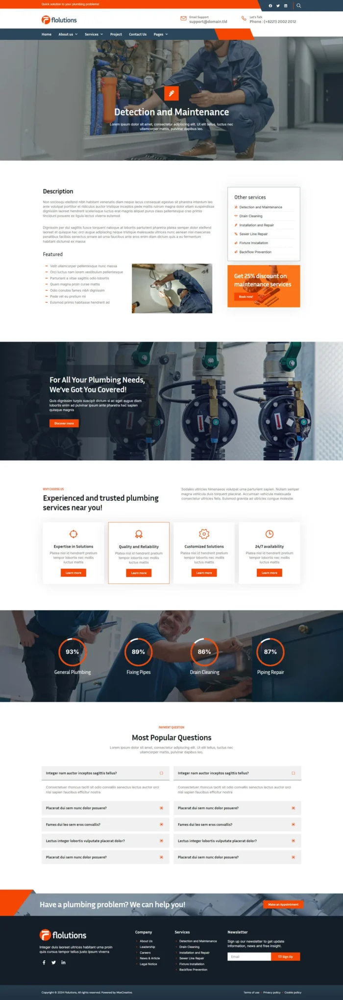 Flolution is an Elementor Template Kit for plumbing service websites. This template has modern layout with simple, professional and clean style. Suitable for any business related to plumbing service & repair. You can easily build any website related to any service and maintenance such as plumbing website, painting service, handyman, cleaning service, home repair etc. Just drag and drop, no coding required.