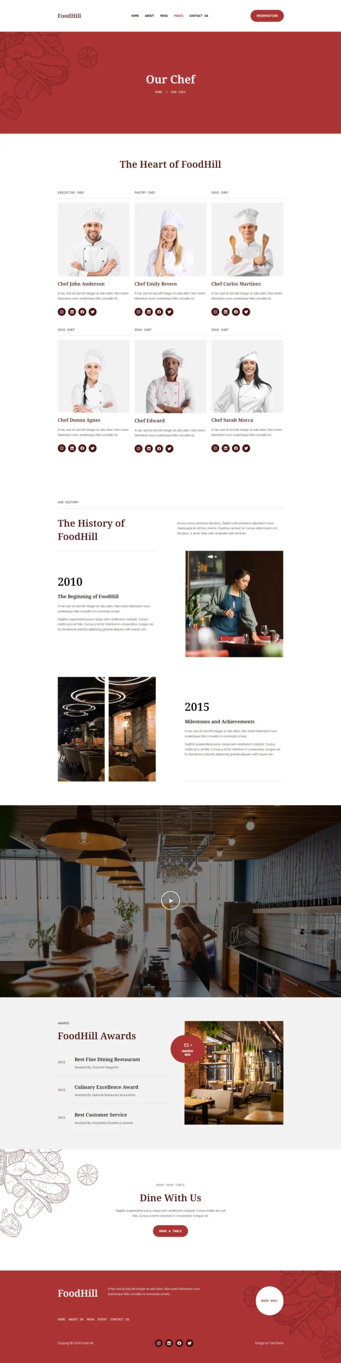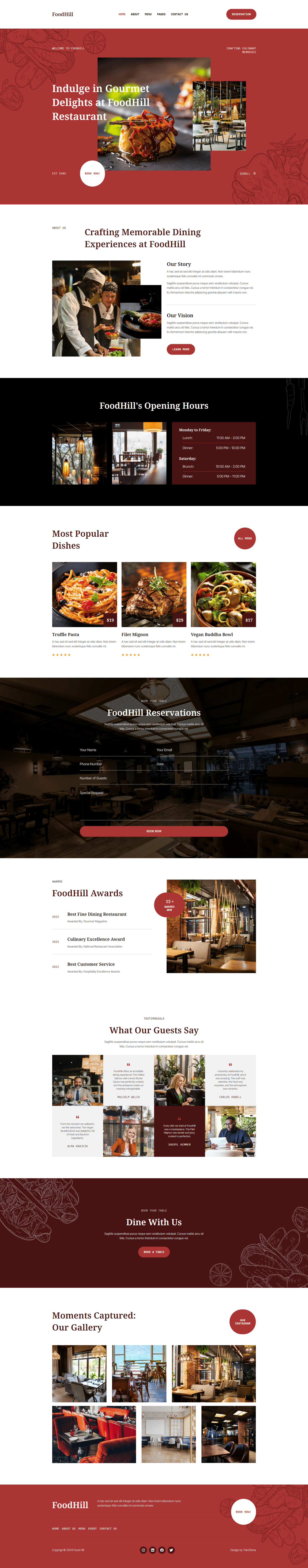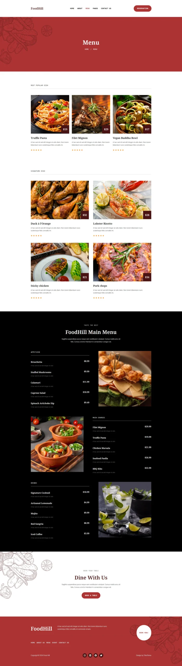 FoodHill is anElementor Kit is designed to provide a sophisticated and feature-rich platform for showcasing your culinary delights and exceptional services. The Home page offers a visually stunning introduction to your restaurant, enticing visitors with mouth-watering images and a welcoming layout. Share your story on the About Us page, and display your delectable dishes on the Menu page to captivate potential diners.