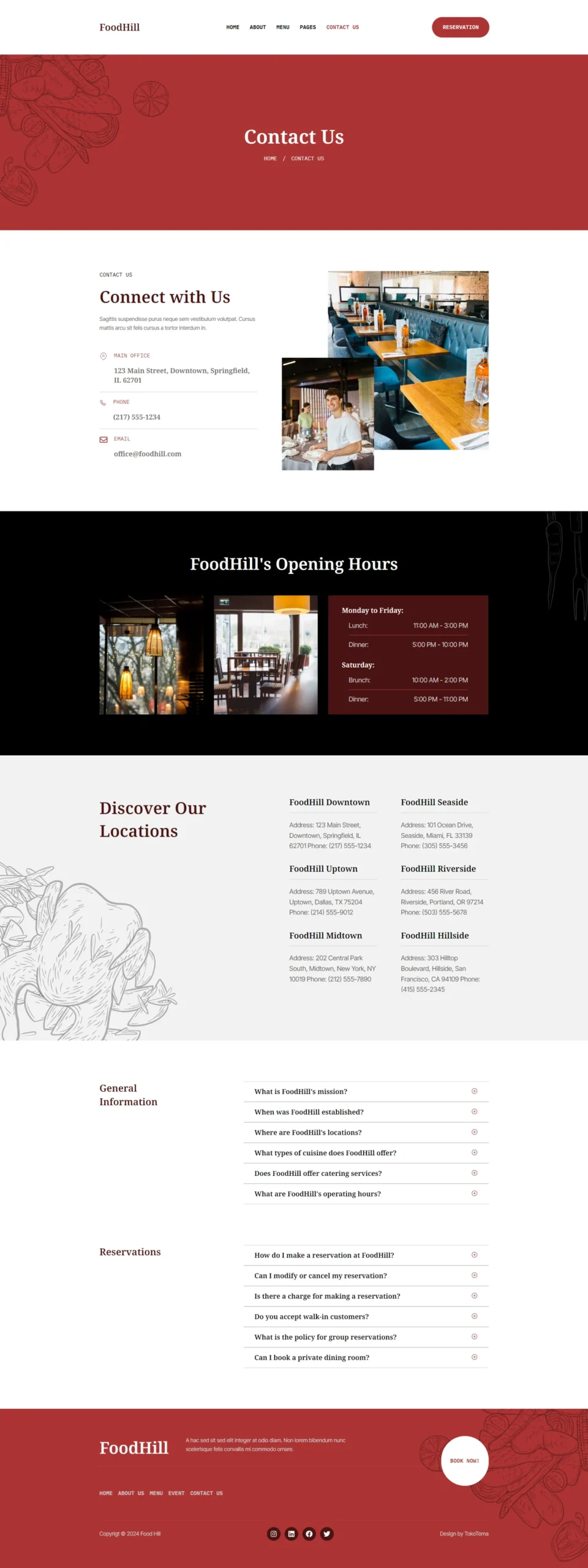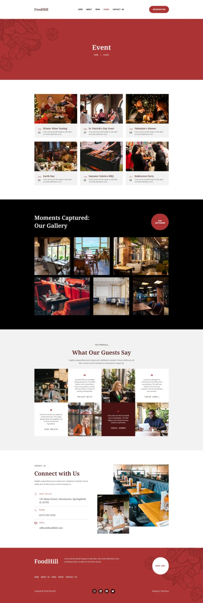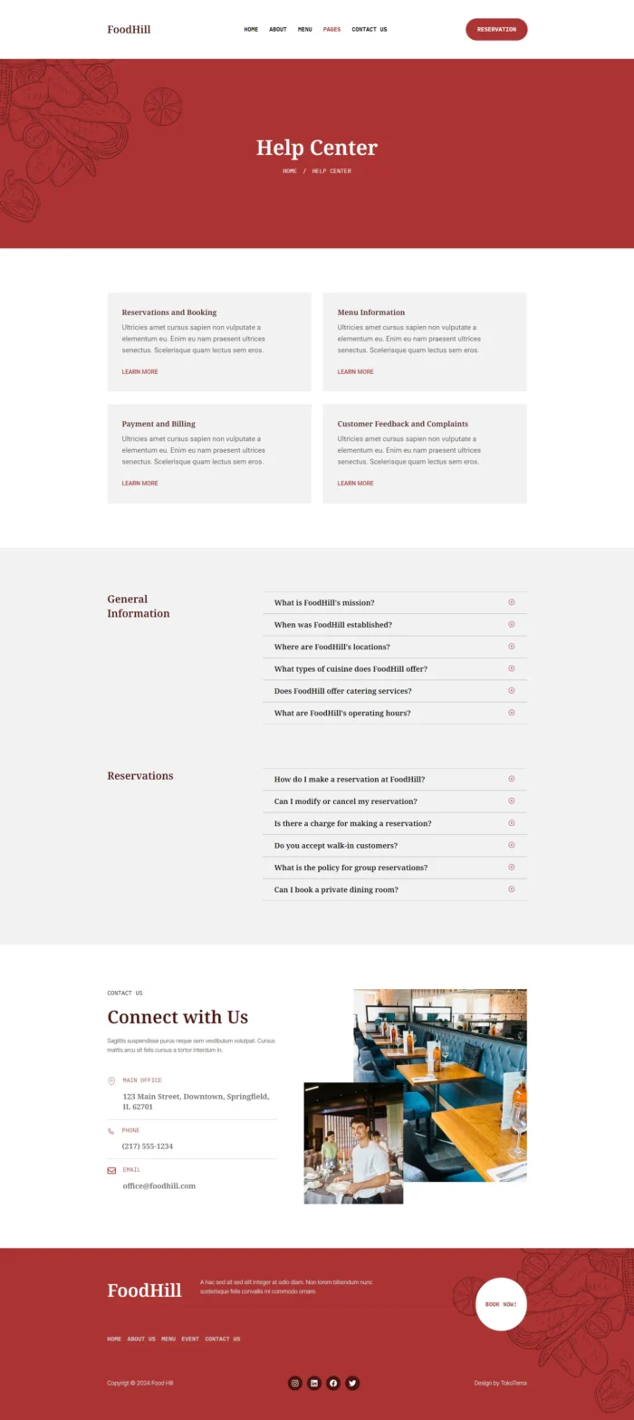 Allow customers to effortlessly make reservations with the Reservation page. Highlight your talented culinary team on the Our Chef page and showcase your restaurant’s ambiance with the Gallery page. Promote special events on the Events page and provide easy access to customer support through the Contact Us and Help Center pages. This template ensures a seamless and engaging user experience, making it the perfect choice for any restaurant looking to enhance its digital footprint.