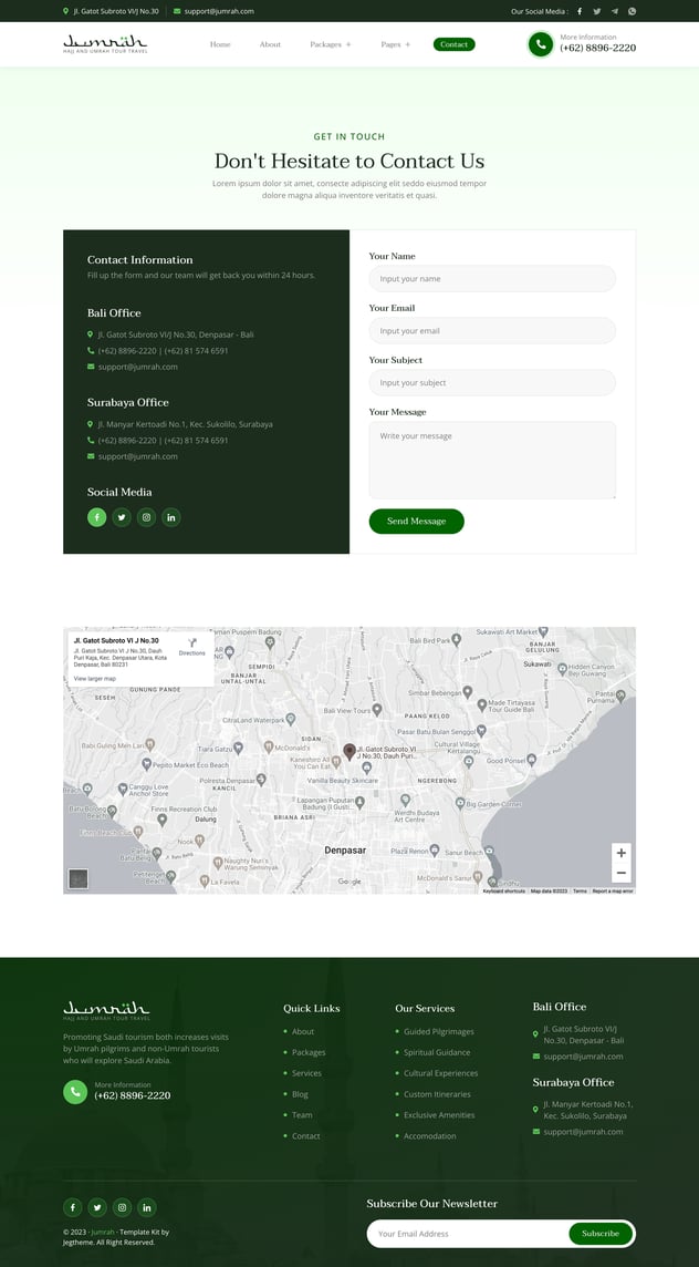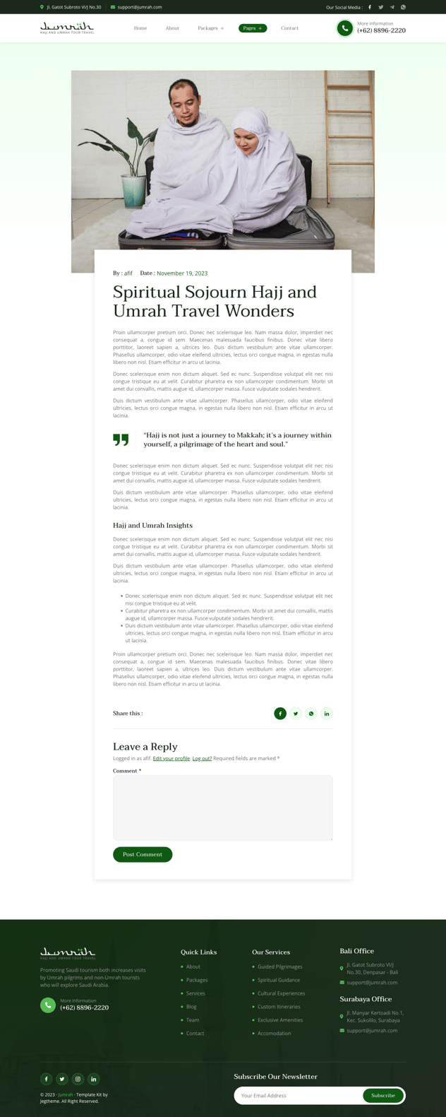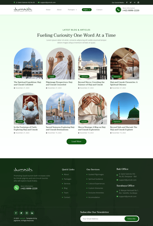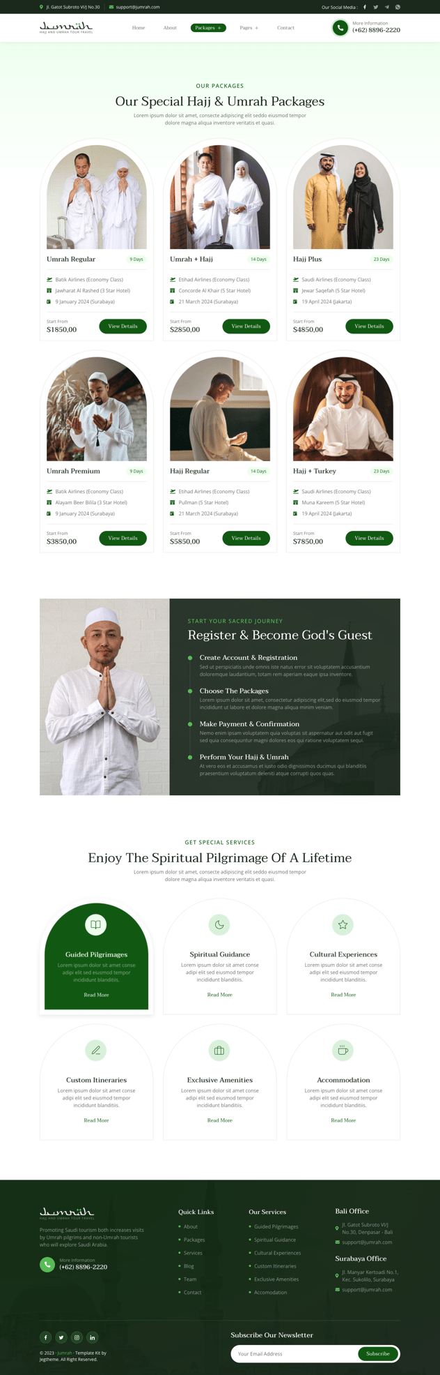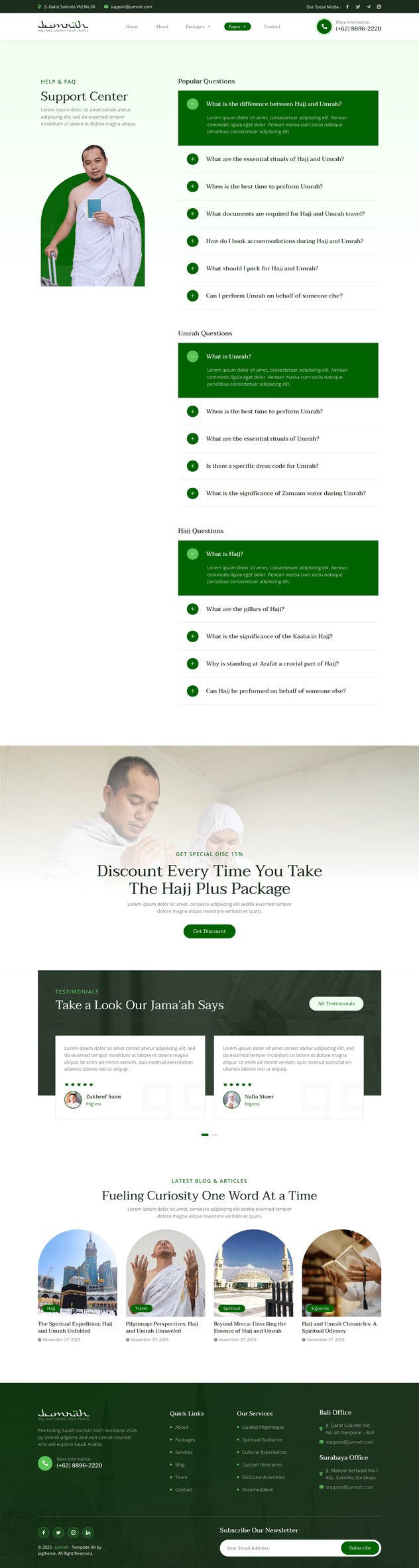 Jumrah is a modern and clean Elementor Template Kit that is perfect for those who want to create a professional-looking website for Hajj Agent, Umrah Agency, Islamic Tour, Muslim Travel Package, Pilgrimage, Mecca and Medina Tour. This kit has a beautiful and unique design with a 100% responsive layout, retina-ready, and very easy to customize because using Elementor so you don’t need a single line of coding!