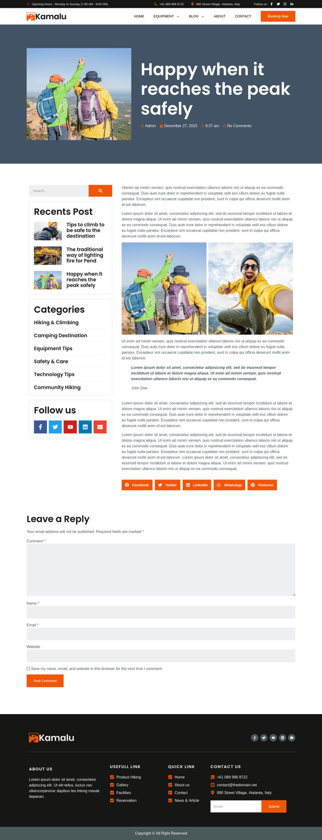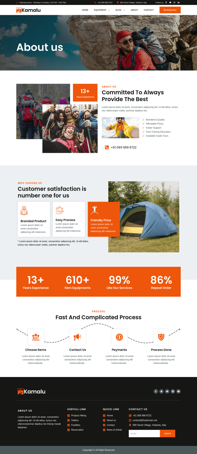 Kamalu – Rental Hiking & Camping Equipment Elementor Pro Template Kit is fully responsive for desktop, tablet and mobile. polished with an interesting color combination. Very suitable for you who want to make website aluminum and glass services for personal or company. This template modern design, clean design, and easy to customize, easy to cange color and many more.
