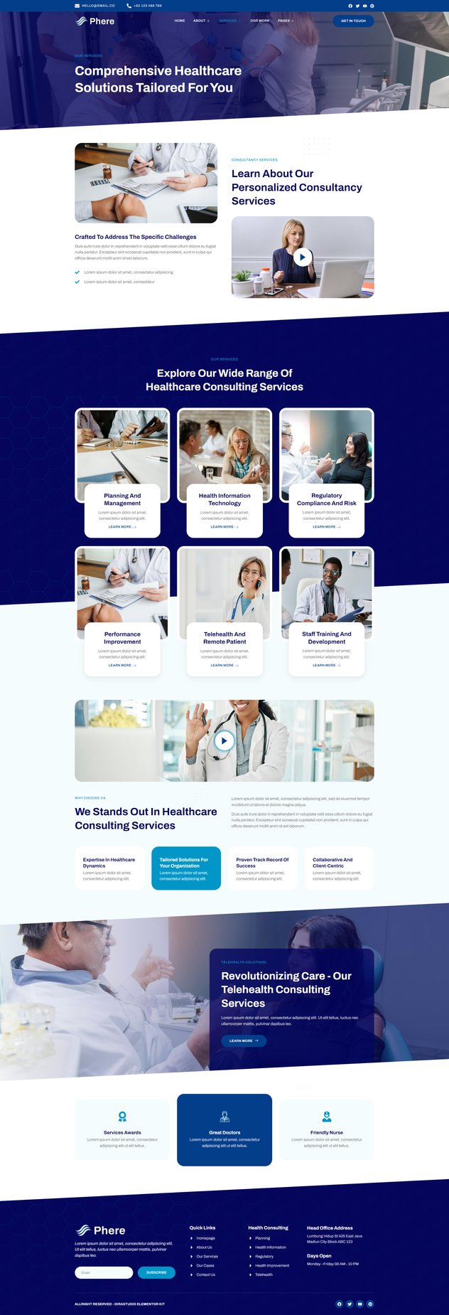 Seamlessly customizable through Elementor, our kit ensures your website reflects the trustworthiness and proficiency of your healthcare consulting services. Crafted for optimal performance and SEO-friendly design, the ‘Healthcare Consulting’ Elementor Template Kit is your prescription for creating a visually stunning and impactful online presence in the competitive world of healthcare consultancy. Transform your website effortlessly with this modern and health-ready template kit.