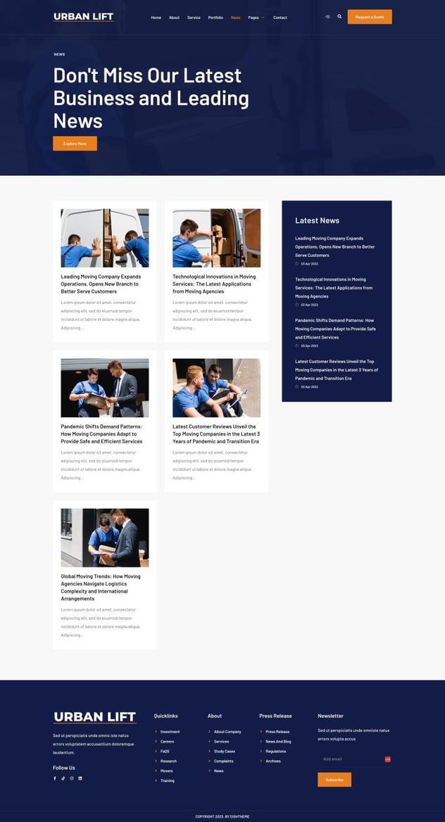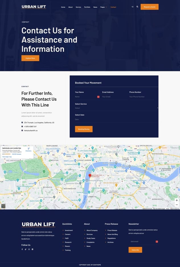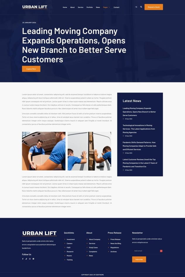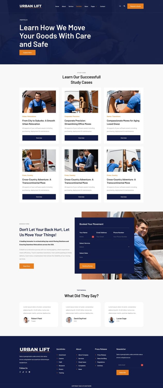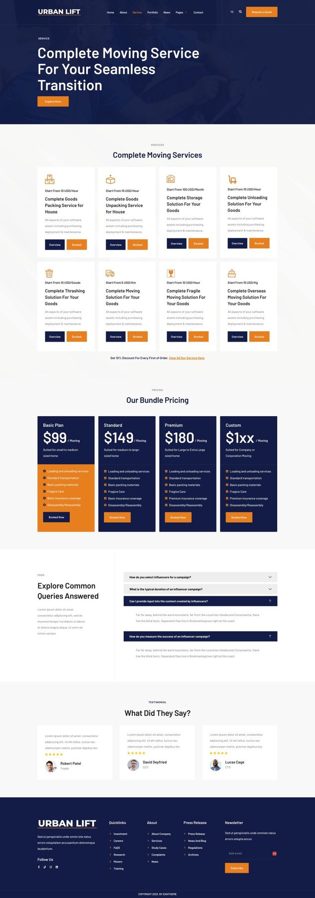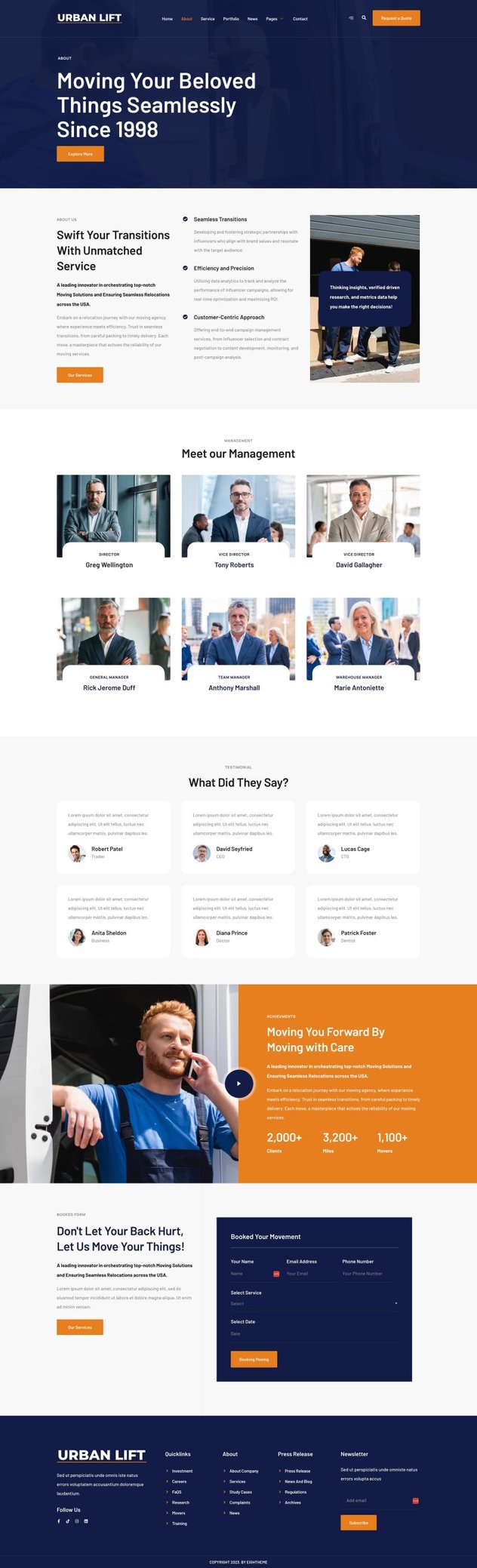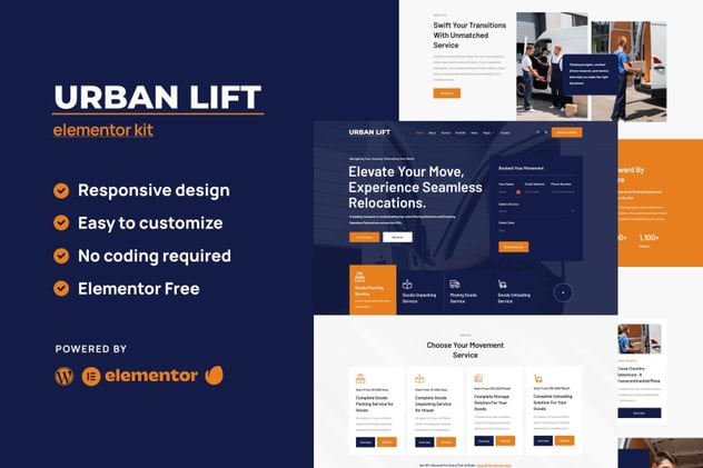 UrbanLift is professional Elementor Template Kit for moving company website. It has simple and clean design with modern layout style. Designed to use with Elementor Free version, ready to import and reusable for moving company website. It works with most themes and is optimized for use with the free Hello Elementor theme.