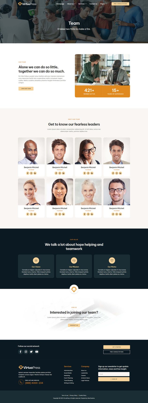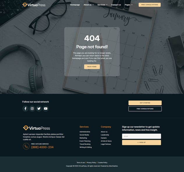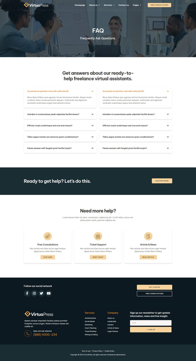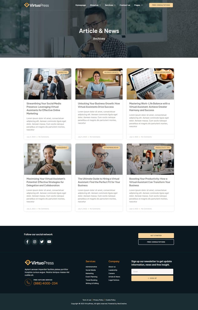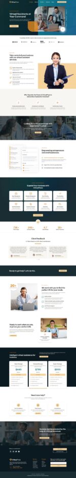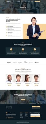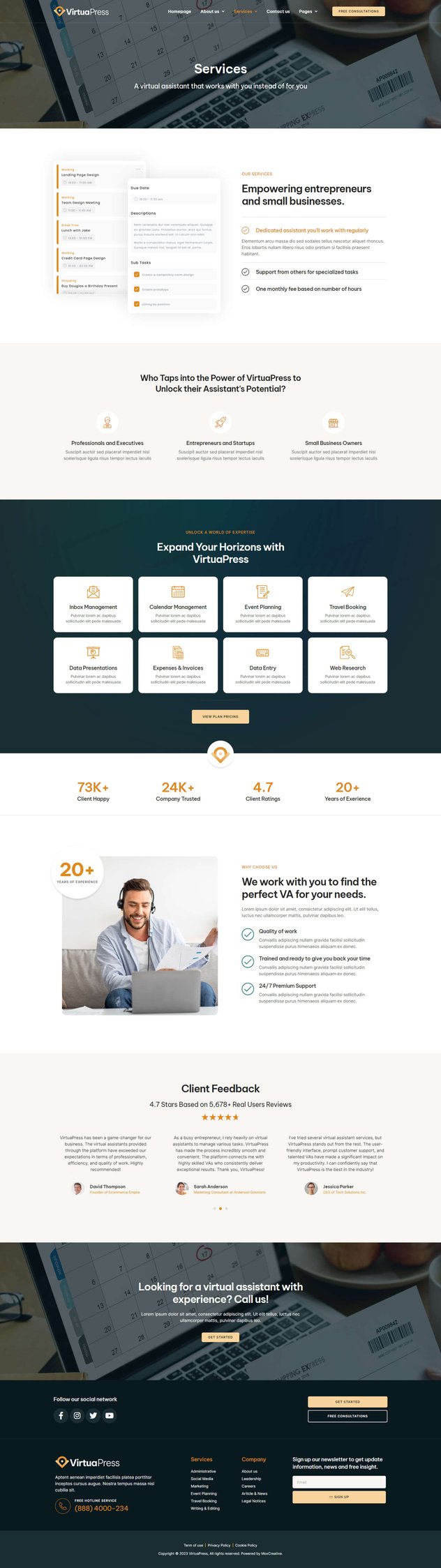 VirtuaPress is a modern and creative template kits for virtual assistant service website. It has 12+ pre-built templates with simple design and modern style. You can also use this creative template kit for any kind of businesses or services such as Virtual Assistant Service, Consultant, Call Center, Corporate Secretary, Virtual Secretary, and other similar remote businesses.