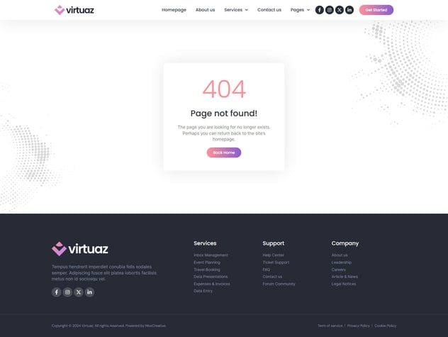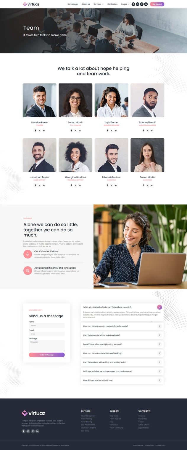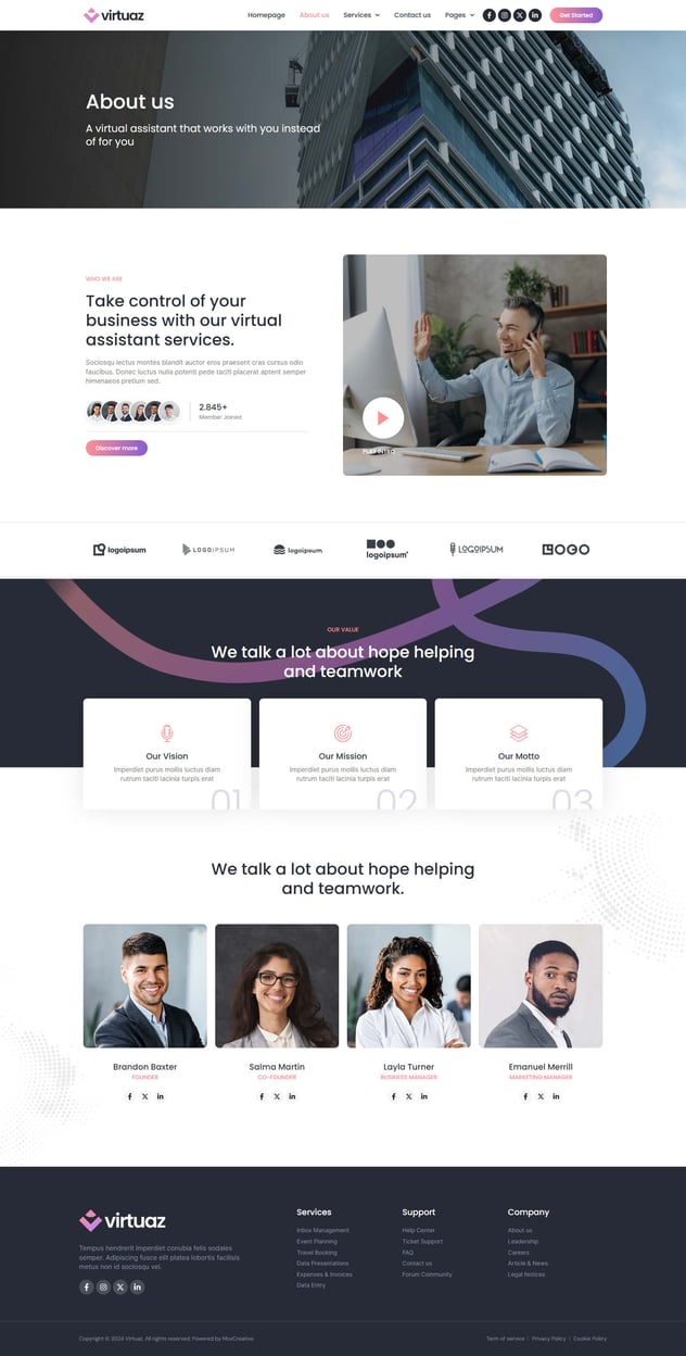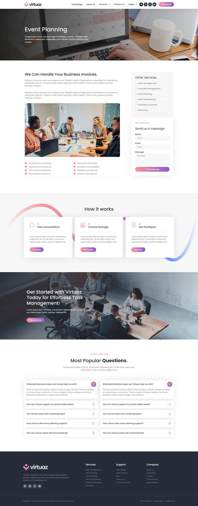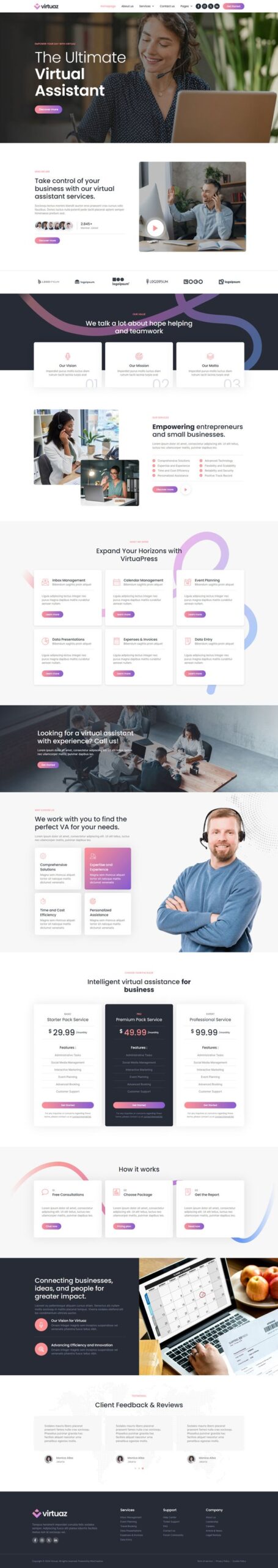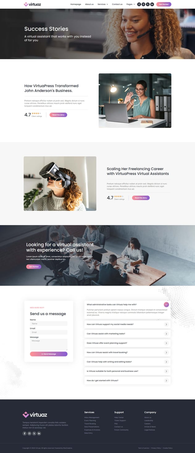 Virtuaz is a modern and creative template kits for virtual assistant service website. It has 12+ pre-built templates with simple design and modern style. You can also use this creative template kit for any kind of businesses or services such as Virtual Assistant Service, Consultant, Virtual Helper, Digital Service, Call Center, Corporate Secretary, Virtual Secretary, and other similar remote businesses.