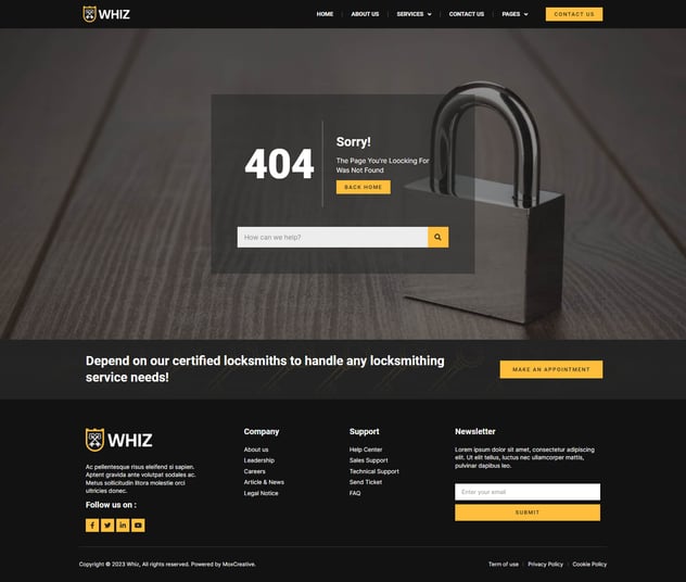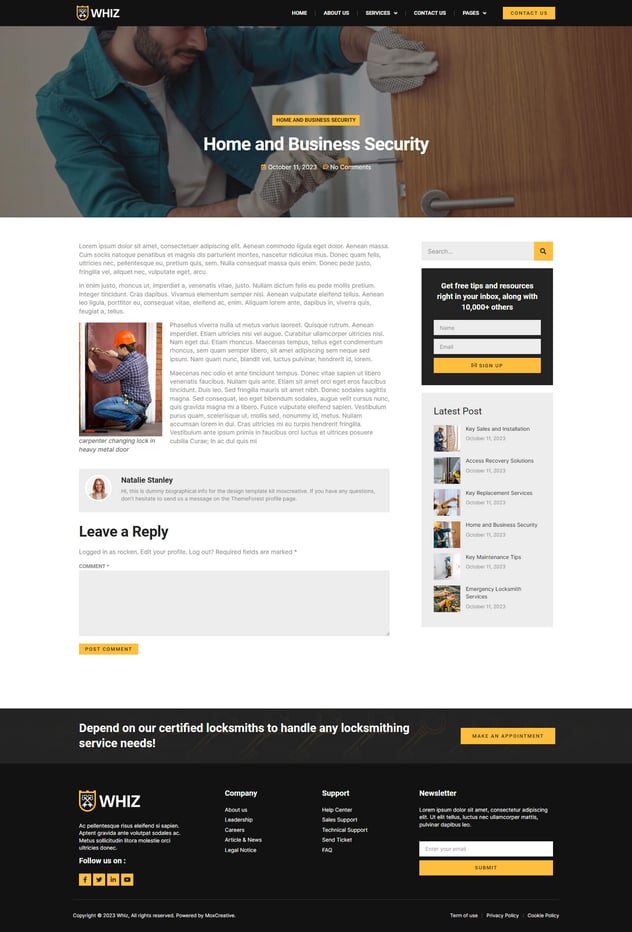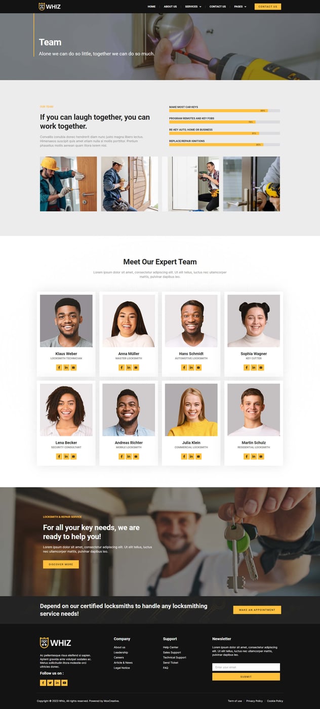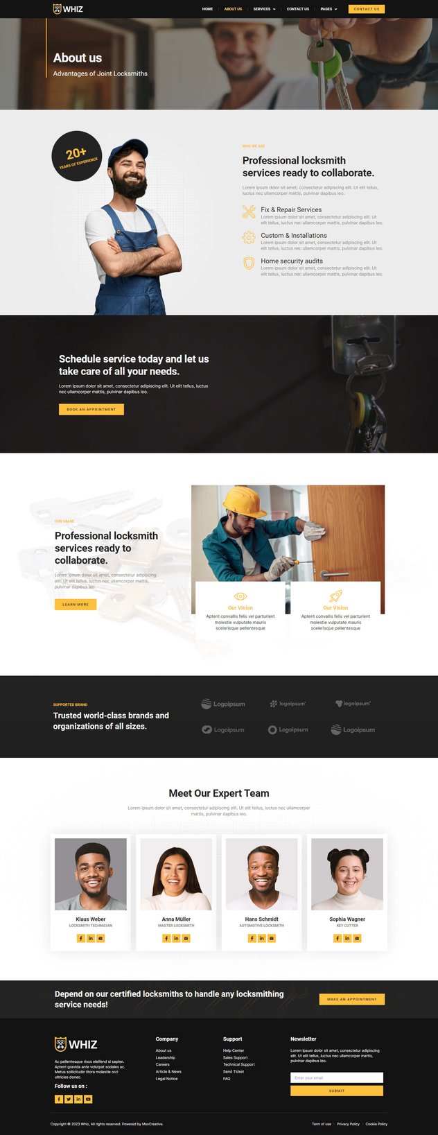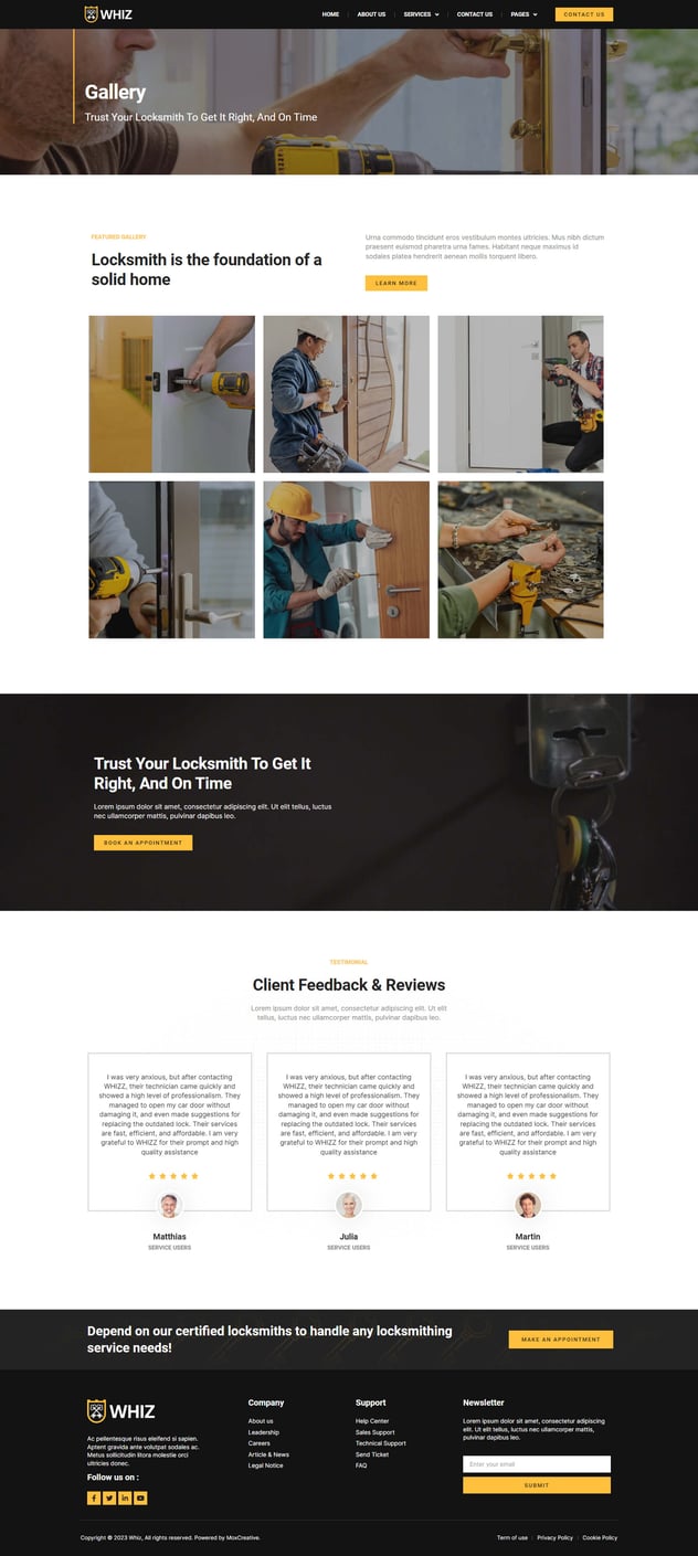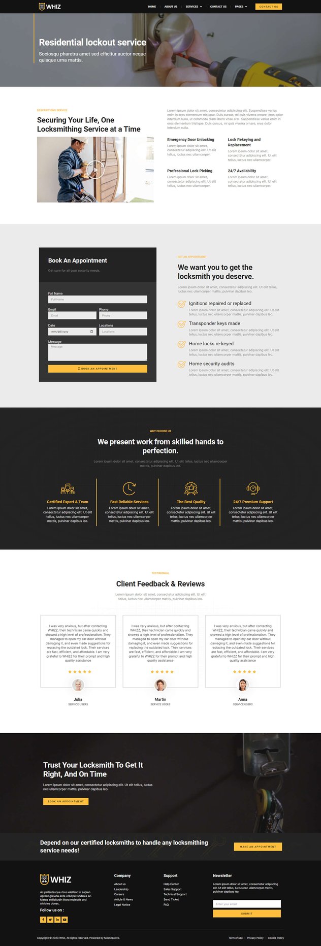 Whiz is Elementor Pro Template Kit for Locksmith & Key Maker Service. This template kit will help you to create any website related to locksmith and key maker service such as key maker, smart lock, door repair, home security service, etc. It has 12+ pre-built templates with clean design and modern style.
