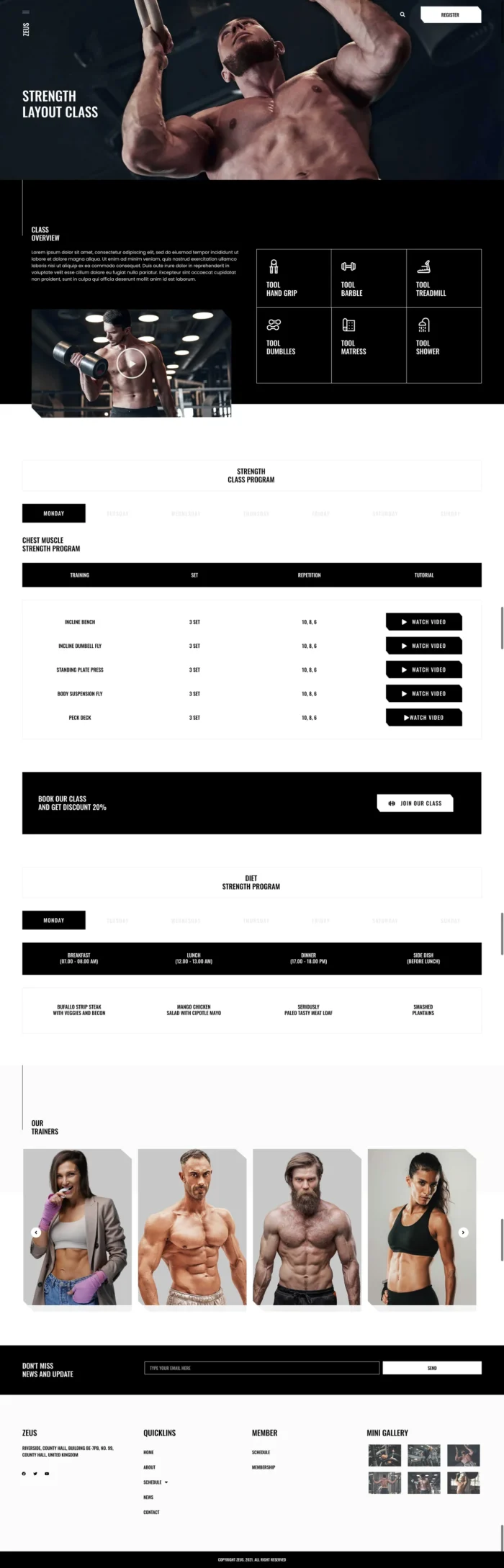 Meet Zeus Gym Elementor Kit, the modern and strong Gym elementor kit for your project. This is kit is fast, powerfull, stylish and modern. It full of features that you need for gym website, from the Class Table, Time Table, Trainer Carousel, Program Carousel, Video Tutorial, Diet Program Table, and so on. This template is fast and easy to edit, supported with a Hello Theme and Elementor. All you need is to drag and drop and replace the images and content in the kit. No code is required to modify this template.